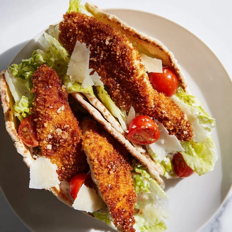 Sometimes I add a layer of sliced avocado inside the pita for creaminess. A few fresh basil leaves mixed with the romaine creates this lovely sweet herbal note. You could even swap the chicken for breaded cauliflower florets if you want a vegetarian version that still delivers that crispy satisfaction.