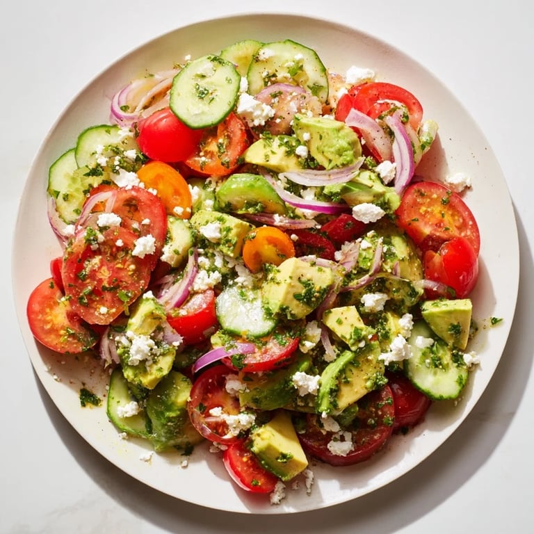 Save A vibrant, refreshing salad bursting with juicy tomatoes, crisp cucumber, creamy avocado, and tangy feta, dressed in a light lemon-olive oil vinaigrette. Perfect as a side or light main.