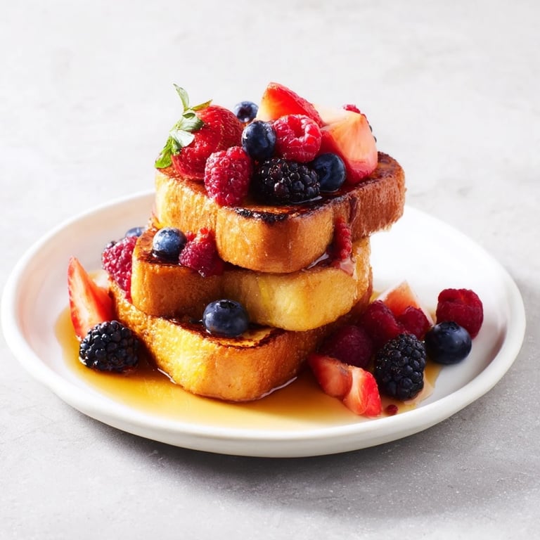 Save Golden, fluffy slices of bread soaked in a cinnamon-vanilla custard, pan-fried to perfection and topped with a vibrant mix of fresh berries and a drizzle of pure maple syrup.