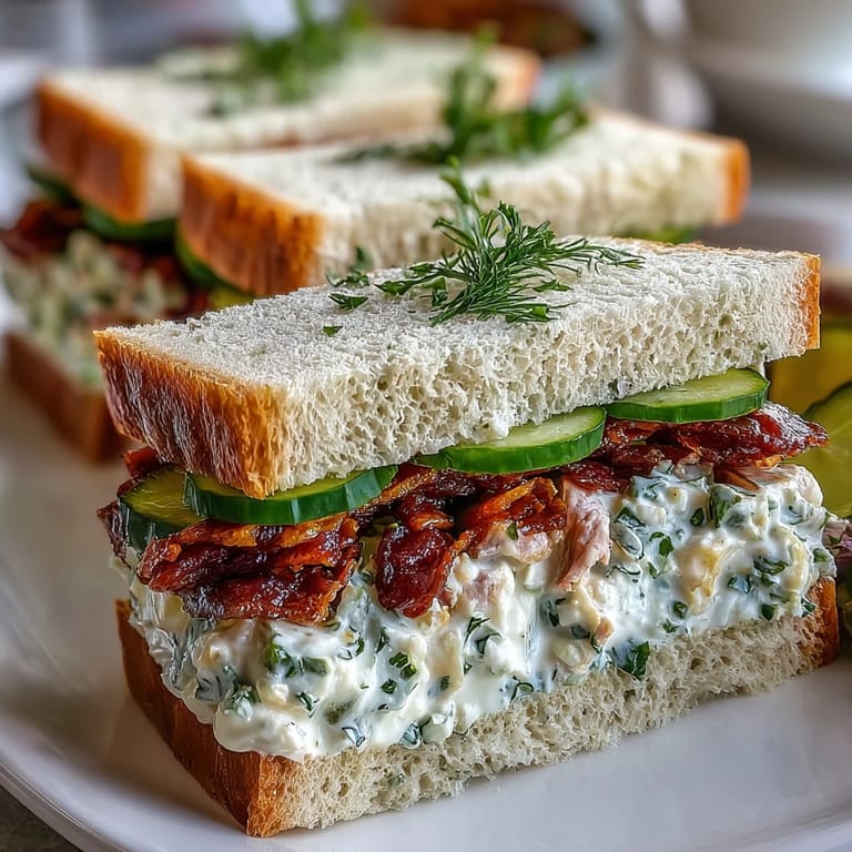 For the best results, use very fresh bread that's soft but sturdy enough to hold the fillings without tearing. When removing crusts, use a sharp serrated knife and cut in one smooth motion to maintain clean edges. For perfectly thin cucumber slices, use a mandoline or sharp knife to ensure uniform thickness. When spreading the cream cheese mixture or egg salad, work gently to avoid tearing the bread—a light hand makes all the difference. To keep sandwiches from drying out during preparation, cover completed sandwiches with a slightly damp paper towel and plastic wrap. Refrigerate until 15 minutes before serving to allow flavors to meld while maintaining freshness.