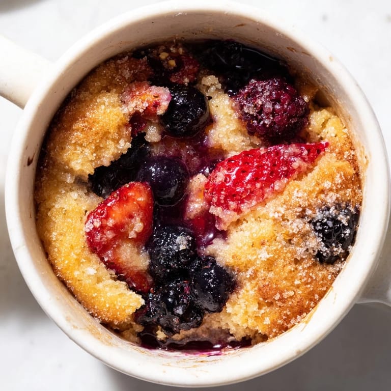 Save Late one Tuesday night, I stood in my kitchen with a sudden craving for something warm and sweet, but zero patience for a full baking project. My eye landed on a mug in the cabinet, and I thought: what if I could fit an entire cobbler into this thing? Five minutes later, golden cake was puffing up in the microwave, and the smell of buttery berries filled my apartment. That moment taught me that sometimes the best desserts aren't the fanciest ones—they're the ones you can make faster than it takes to decide whether you actually want dessert.