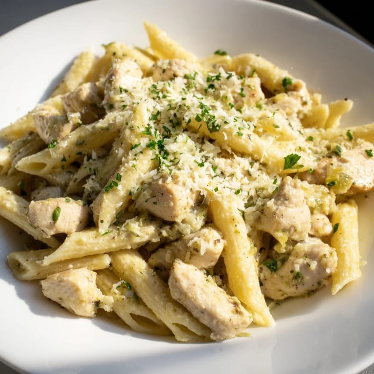 Save There's something about a weeknight kitchen that demands speed without sacrifice, and this garlic Parmesan chicken pasta has become my answer to that impossible equation. The first time I made it, I was racing against the clock before my daughter's soccer pickup, but instead of ordering takeout, I threw together what I had in the pantry. Twenty minutes later, we were sitting down to something that tasted like I'd spent the afternoon simmering and stirring. That's when I knew this recipe had earned its permanent spot in rotation.
