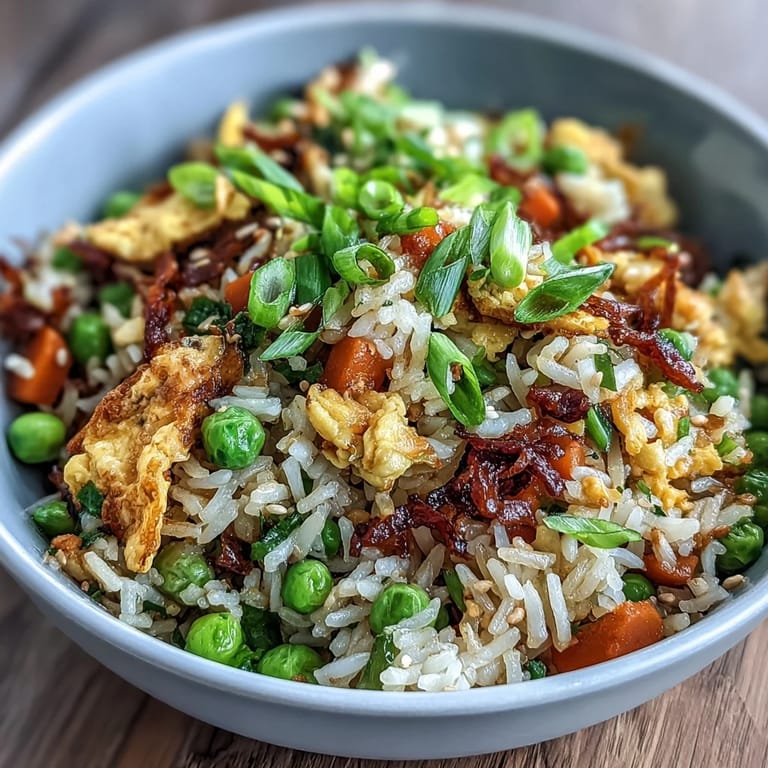 Use leftover rice for best texture—freshly cooked rice can become mushy when stir-fried. If you only have fresh rice, spread it on a baking sheet and refrigerate for at least an hour to dry it out. Make sure your wok or skillet is very hot before adding ingredients; this ensures the vegetables get that perfect stir-fry char without becoming soggy. Work quickly and keep everything moving in the pan to prevent sticking and ensure even cooking. Have all your ingredients prepped and ready before you start cooking, as the actual stir-frying process moves very fast.