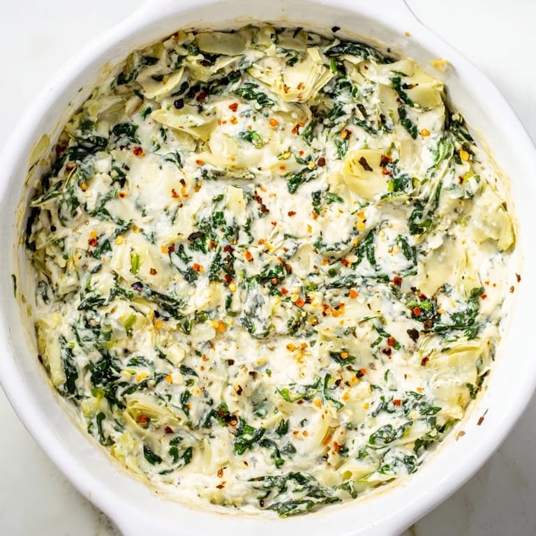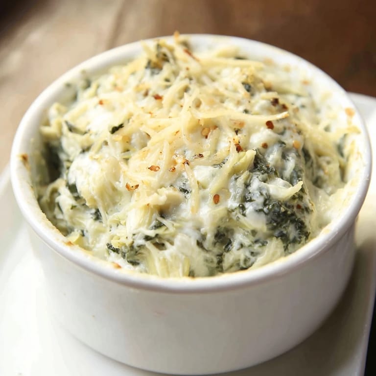 Save A creamy, cheesy dip loaded with tender spinach and artichoke hearts, perfect for serving warm with bread or crackers as a comforting appetizer.